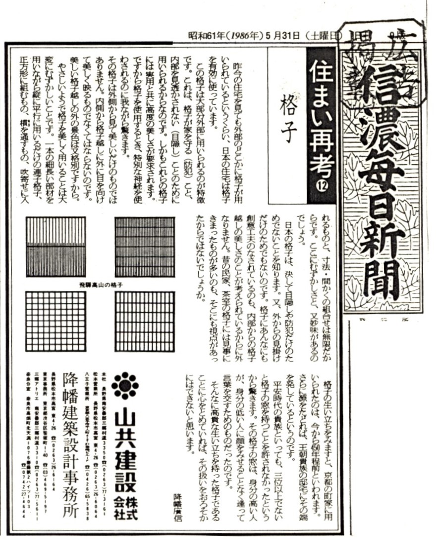 続きを読む秋の気配が日に日に増してきました。窓の外には彼岸花が咲き、赤とんぼが元気に飛び交う安曇野から窓廻りのお話です。 昨今の住宅を見ても外部のどこかに格子が用いられているというくらい、日本の住宅は格子を有効に使っています。 この格子は大部分外部に用いられるのが特徴です。これは、格...