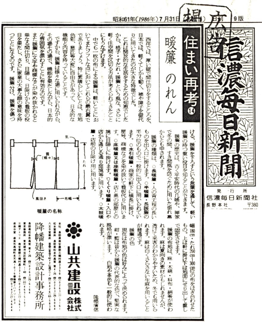 2月ですが温暖な日が続いています。日によって風向きが変わり、換気で開けた窓際のカーテンや暖簾が揺れています。そんな暖簾についてのコラムを紹介します。 西洋では、厚い壁で間仕切りするところを、日本では、軽くてしかも動く、襖や商事を壁代りに用いてきたのが大きな特徴でした。 これは...